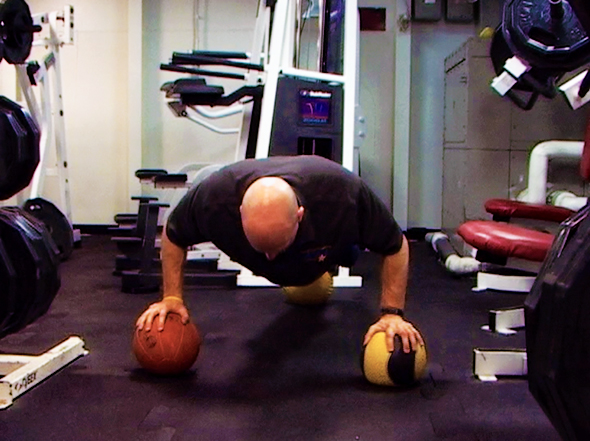 Clock pushups consist of assuming a shoulder-width hand position, left hand stationary, while the right hand moves clockwise in an arc motion from one o’clock, two, three, four, five and a six o’clock position. At each clock position, perform the prescribed number of pushups, and then move the right hand the next position. Move onto the opposite hand and repeat. This exercise works the entire shoulder, chest and back regions.